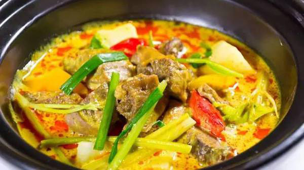 4、取涮火鍋用的鍋,倒入壓好的牛腩土豆放入鍋內(nèi),放入風(fēng)苼記馬來西亞咖喱塊;